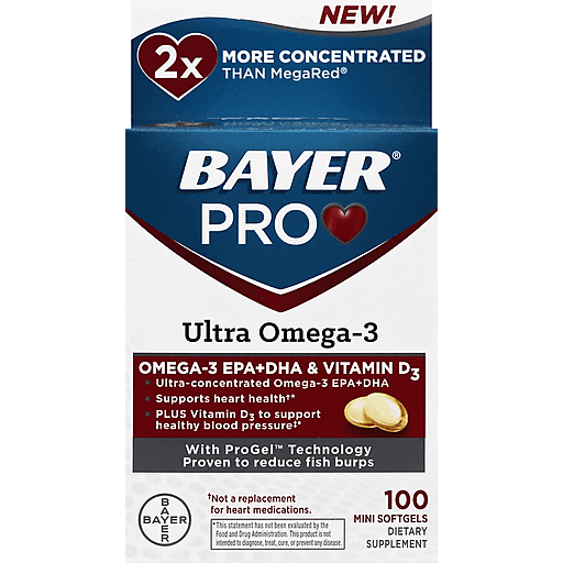 Dietary Supplement. 2x more concentrated than MegaRed. Omega-3 EPA + DHA & Vitamin D3. Ultra-concentrated omega-3 EPA + DHA. Supports heart health (not a replacement for heart medications). Plus vitamin D3 to support healthy blood pressure (blood pressure levels already within the normal range). With ProGel technology proven to reduce fish burps. EPA + DHA. Why is EPA + DHA in Omega-3 So Important? Though fish oils contain a variety of fatty acids, leading heart health experts recognize that it's the beneficial EPA + DHA that are important in supporting heart health. Omega-3 EPA + DHA may reduce the risk of heart disease (Supportive but not conclusive research shows that consumption of EPA + DHA omega-3 fatty acids may reduce the risk of coronary heart disease). How is BayerPro Ultra Omega-3 Different? More than 2X the concentration of MegaRed. MegaRed: 25% EPA + DHA. Bayer Pro: 60% EPA + DHA. BayerPro mini softgels are ultra concentrated. Containing 60% heart health supporting EPA + DHA, they're 2 times more concentrated than MegaRed. Plus the mini softgels feature ProGel technology proven to reduce fish burps. What the Heart Health Experts Put Inside BayerPro: Supports You in Two Ways: Omega-3 EPA + DHA may reduce the risk of heart disease (Supportive but not conclusive research shows that consumption of EPA + DHA omega-3 fatty acids may reduce the risk of coronary heart disease). Vitamin D3 helps support healthy blood pressure (blood pressure levels already within the normal range). Proven Fish Burp Reduction: The only brand with ProGel technology proven to reduce fish burps. Naturally & Sustainably Sourced: Naturally sourced from wild-caught, sustainable fisheries. Ultra-purified. Gluten free. Questions or comments? Please call 1-800-331-4536 (Mon-Fri 9AM - 5PM EST). (This statement has not been evaluated by the Food and Drug Administration. This product is not intended to diagnose, treat, cure, or prevent any disease.) Made in the USA of US & imported materials.